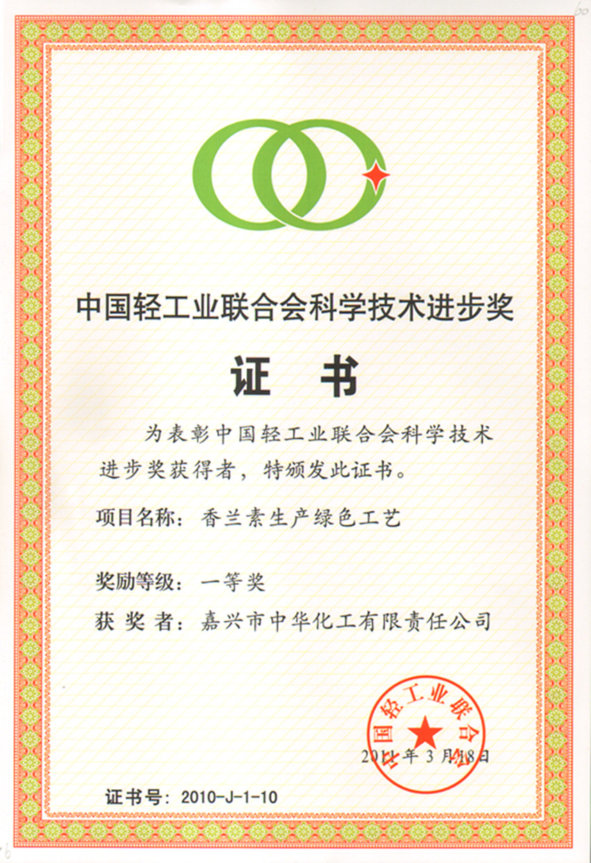 日前,中國輕工業(yè)聯(lián)合會第三次會員代表大會在京召開,會上對2010年度中國輕工業(yè)聯(lián)合會科學技術獎獲獎企業(yè)進行了頒獎,嘉興市中華化工有限責任公司“香蘭素生產(chǎn)綠色工藝”榮獲“2010年度中國輕工業(yè)聯(lián)合會科學進步獎一等獎”,全國人大常委會副委員長陳至立和全國政協(xié)副主席李金華出席大會并為獲獎者頒獎。據(jù)悉,該獎項代表國家輕工行業(yè)最高技術獎勵,屬于國家部級科技獎勵,中華化工也成為我國食品添加劑行業(yè)唯一獲此殊榮的企業(yè)。