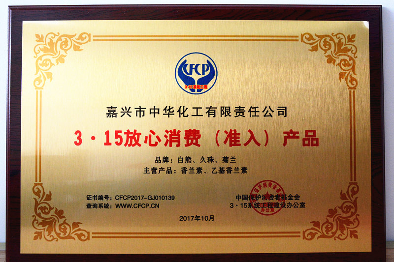 為貫徹落實(shí)黨和政府關(guān)于建立健全社會(huì)征信體系,褒揚(yáng)誠(chéng)信,懲戒失信和建立營(yíng)造良好的法制環(huán)境,增強(qiáng)社會(huì)消費(fèi)信心,中國(guó)保護(hù)消費(fèi)者基金會(huì)根據(jù)《消費(fèi)者權(quán)益保護(hù)法》所賦予消費(fèi)者組織的工作職能,開展了推進(jìn)3.15系統(tǒng)工程,發(fā)展維護(hù)消費(fèi)者權(quán)益“3.15誠(chéng)信體系單位”征信“放心消費(fèi)(準(zhǔn)入)品牌/產(chǎn)品”專題活動(dòng)。在本次評(píng)選活動(dòng)中,我公司喜獲“3.15誠(chéng)信體系單位”榮譽(yù)稱號(hào);白熊、久珠、菊蘭牌香蘭素、乙基香蘭素榮膺“放心消費(fèi)(準(zhǔn)入)品牌/產(chǎn)品”榮譽(yù)稱號(hào)。