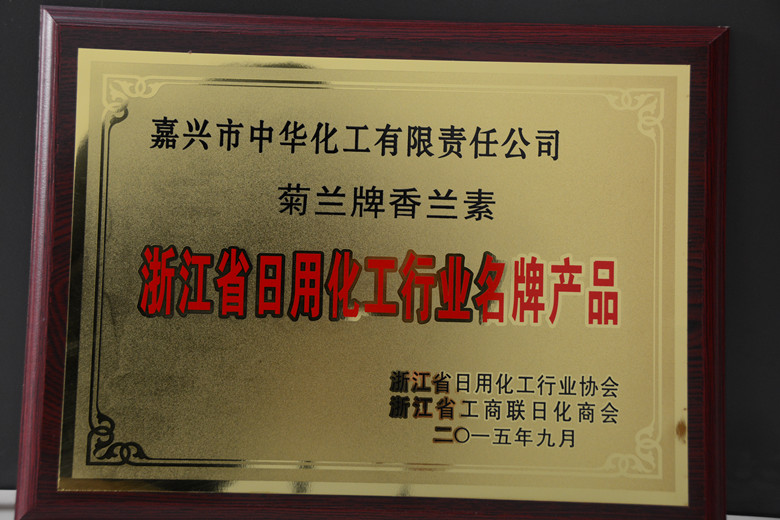 2015年12月4日,浙江省日化行業(yè)協(xié)會五屆六次理事會在浙江鐵道大廈順利召開。會上對浙江省日化行業(yè)名牌產(chǎn)品進行了頒獎,我公司生產(chǎn)的“菊蘭”牌香蘭素、乙基香蘭素榮獲浙江省日化行業(yè)名牌產(chǎn)品。公司注冊商標“久珠”現(xiàn)為中國馳名商標、浙江省著名商標和浙江省出口名牌,“久珠”牌香蘭素、乙基香蘭素為浙江省名牌產(chǎn)品。相信“久珠”和“菊蘭”的珠聯(lián)璧合,一定能將中華化工的香蘭素事業(yè)做得更大更強。