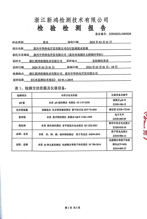 報(bào)告名稱:2024年中華熱電3月廢水檢測報(bào)告