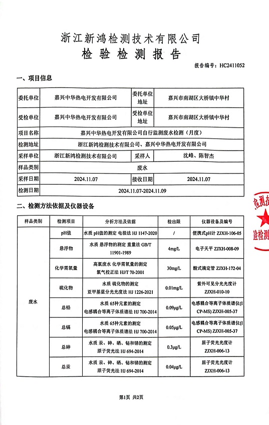 報告名稱:中華熱電11月廢水檢測報告