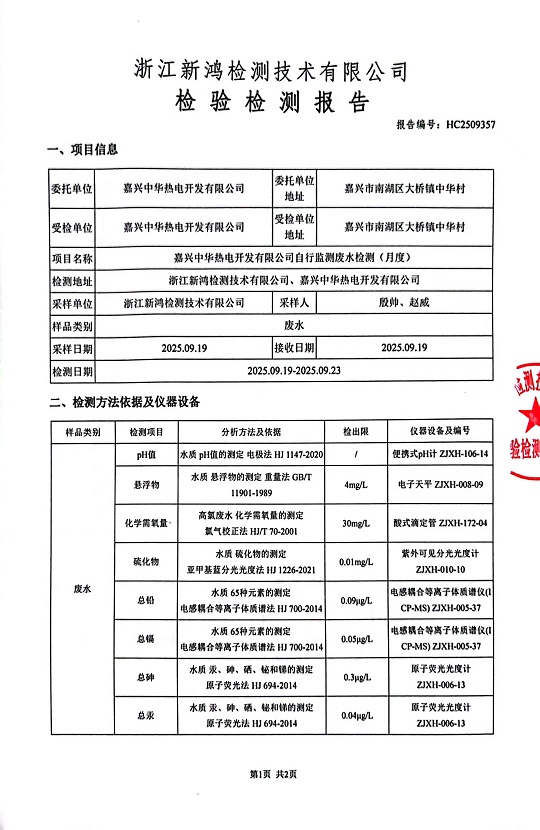 報(bào)告名稱:中華熱電9月廢水檢測報(bào)告