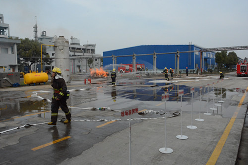 本次演練分為技能表演賽和事故演練兩個部分。技能表演賽由本公司專職消防隊員參加實施,內(nèi)容包括:“原地佩戴空呼器、水帶出水實操、著消防服堵漏”三個消防技能項目;事故演練部分內(nèi)容分為“車間制冷工段液氨泄露事故應急救援演練”和“生產(chǎn)車間火災事故應急救援演練”兩個項目,演練人員由南湖區(qū)消防大隊、大橋鎮(zhèn)、中華化工專職消防隊三支訓練有素的消防隊伍組成,中華化工企業(yè)職工、南湖區(qū)安監(jiān)局、環(huán)保局等相關工作人員共計50余人參加了事故應急救援演練。